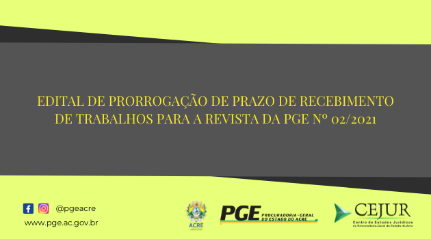 O Procurador-Chefe do Centro de Estudos Jurídicos, no uso de suas atribuições legais, após deliberação da Comissão Editorial da PGE/AC, relativamente ao estabelecimento de prazo para recebimento de trabalho técnico-científico para publicação na 15ª edição da Revista Jurídica da PGE/AC, consoante o Edital de Abertura de Nº 01/2021, que fixara o prazo até 21 de maio de 2021, TORNA PÚBLICO, para conhecimento dos interessados, que foi prorrogado até o dia 21 de junho de 2021 o prazo de recebimento de trabalho técnico-científico, nos termos do Edital de Abertura retrocitado e do Regulamento nº 01/2019.