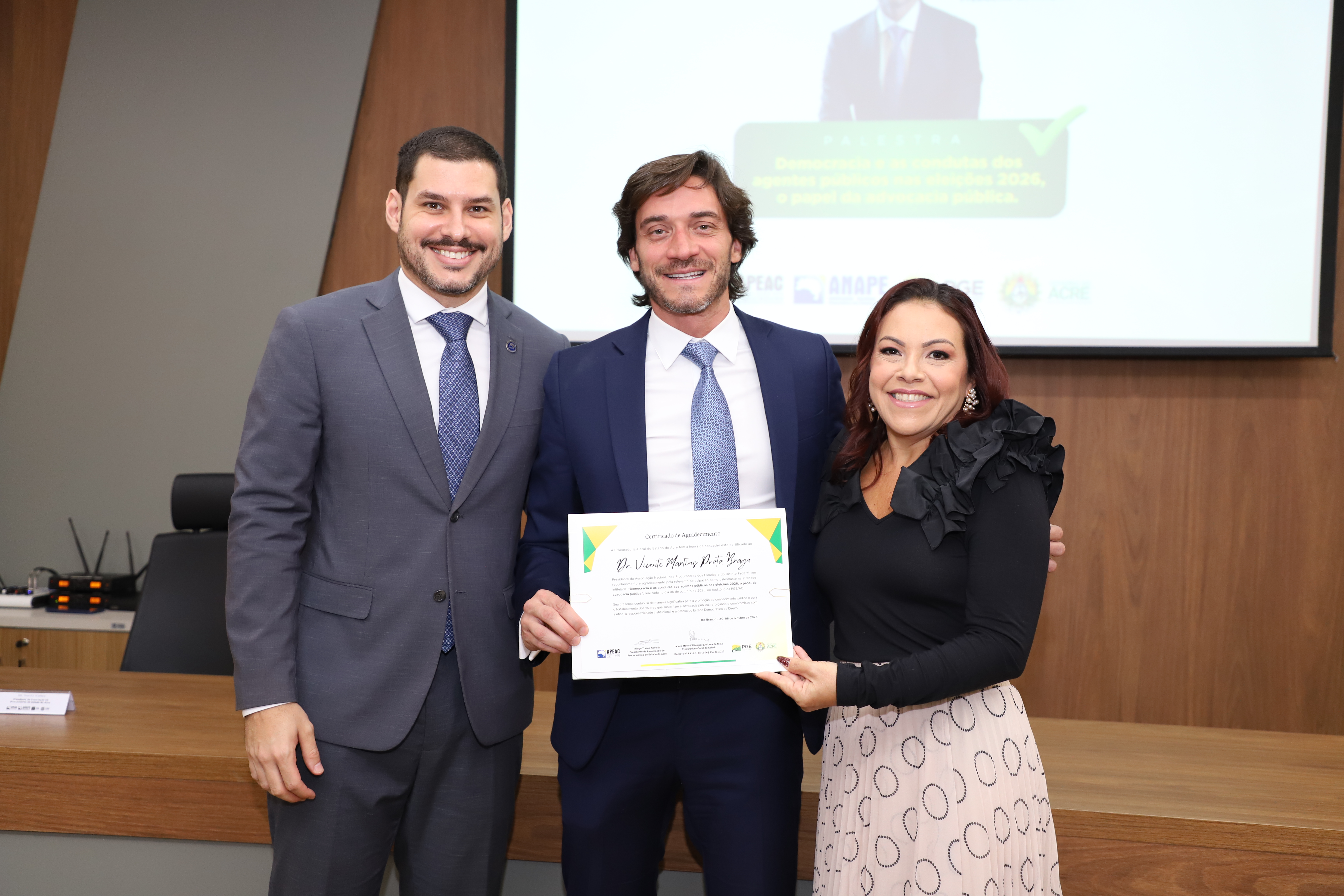 A Procuradoria-Geral do Estado (PGE/AC), em parceria com a Associação Nacional dos Procuradores dos Estados e do Distrito Federal (Anape) e com a Associação dos Procuradores do Estado do Acre (Apeac), realizou nesta segunda-feira, 6, a palestra “Democracia e as condutas dos agentes públicos nas eleições 2026: o papel da advocacia pública”, com o presidente da Anape, Vicente Braga.